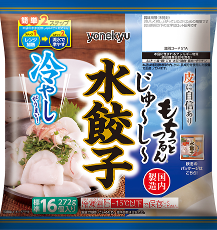 今回買ってきて食べたのは、沼津が本社の食品メーカー「米久(よねきゅう)」さんの商品、「もちっとつるんじゅーしー水餃子」。