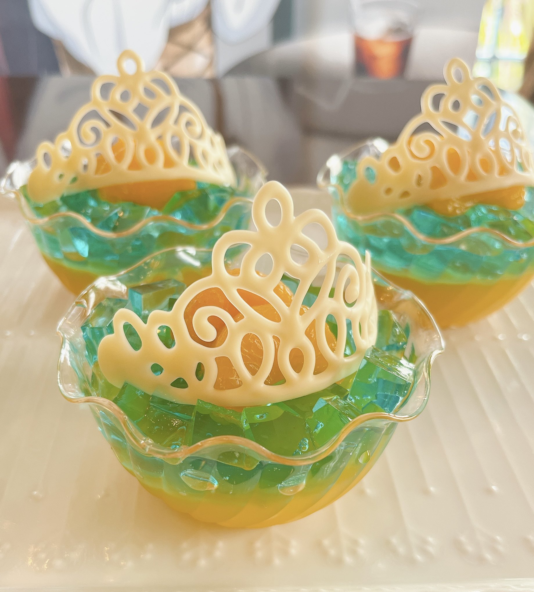みかんの風味たっぷりの甘酸っぱくフルーティーなゼリーの上には、ほんのり甘く涼やかなブルーハワイのゼリー。