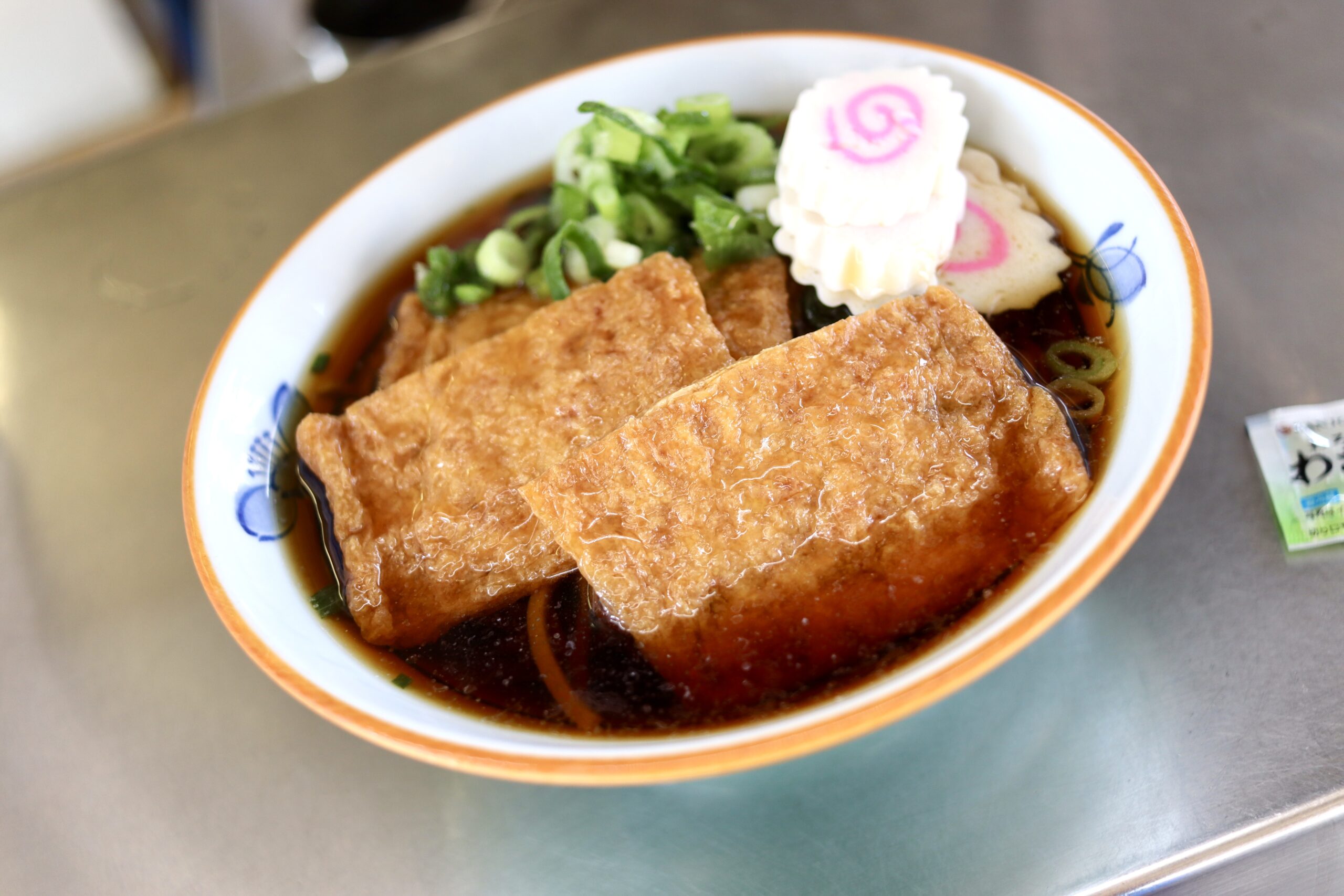濃い色のおつゆに、たっぷりの麺、青ネギにナルトに油揚げ。銀色のカウンターに載せられたたたずまいもどこか懐かしげで風情たっぷりです。