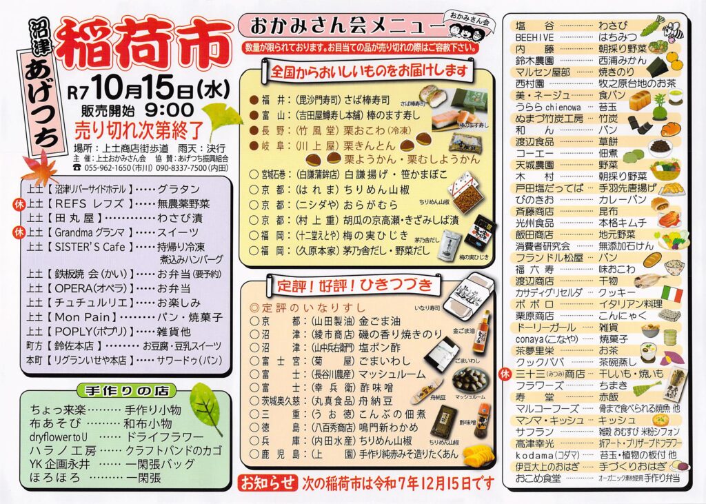沼津市上土町周辺「沼津あげつち商店街」の朝市「あげつち稲荷市」が10月15日に開催されます。