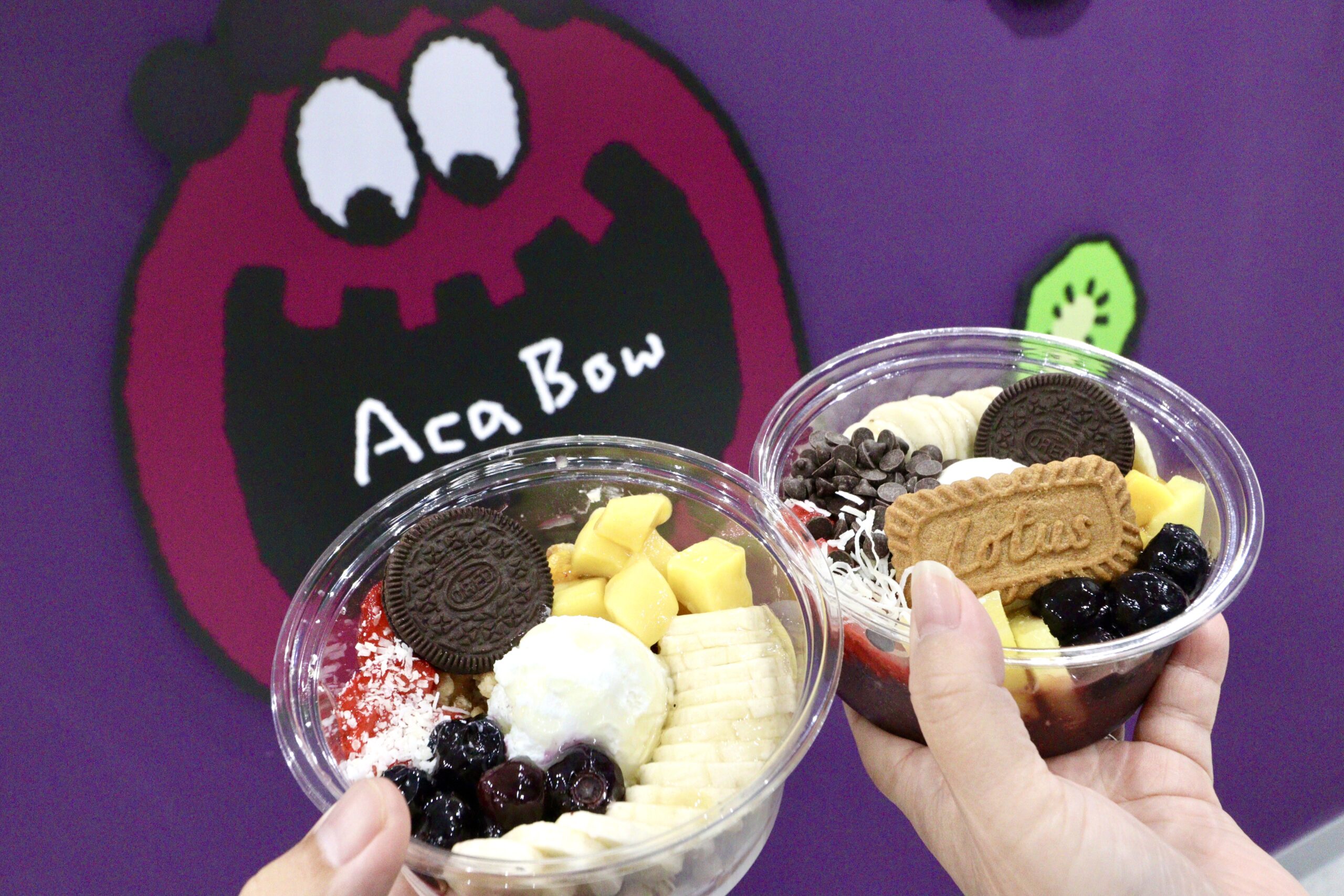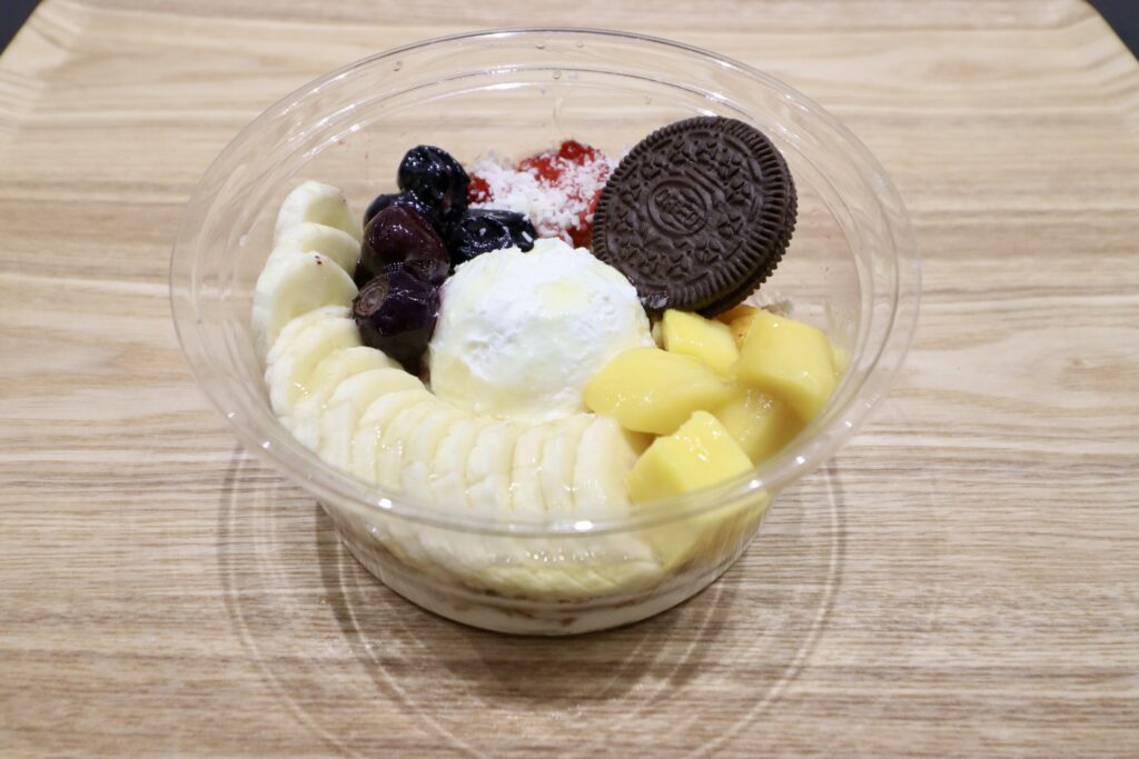 アサイーをベースに、フルーツはイチゴやバナナやマンゴーなど5種類、トッピングはチョコチップにオレオの2種類。