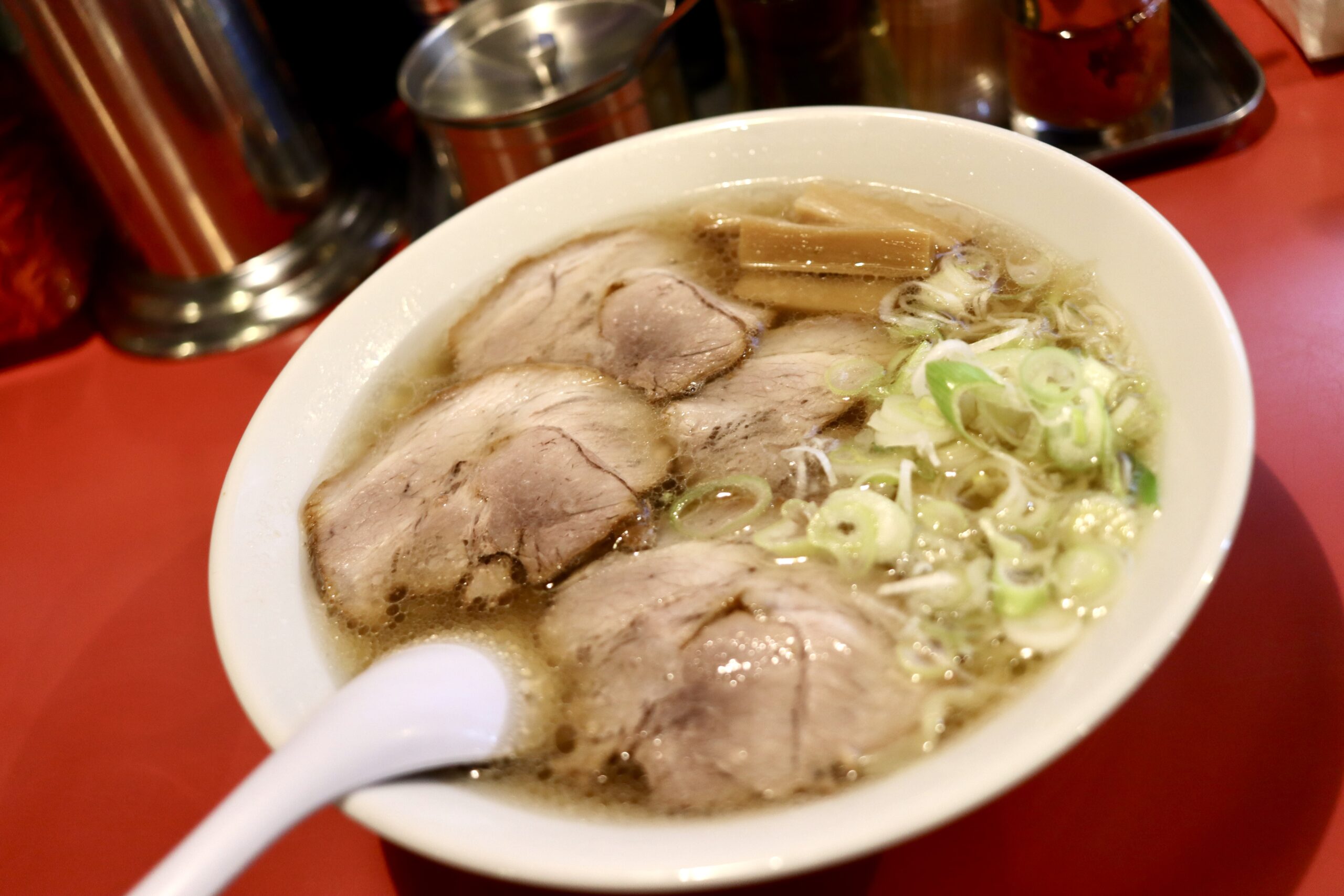 黄金色に透き通ったスープの上に、刻みネギ、チャーシュー、メンマ、というシンプルで王道のビジュアル。