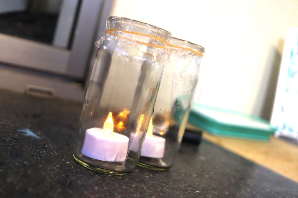 キャンドルは雨風でも消えないような、LEDライトのものがビンとセットになって300円で販売されます。