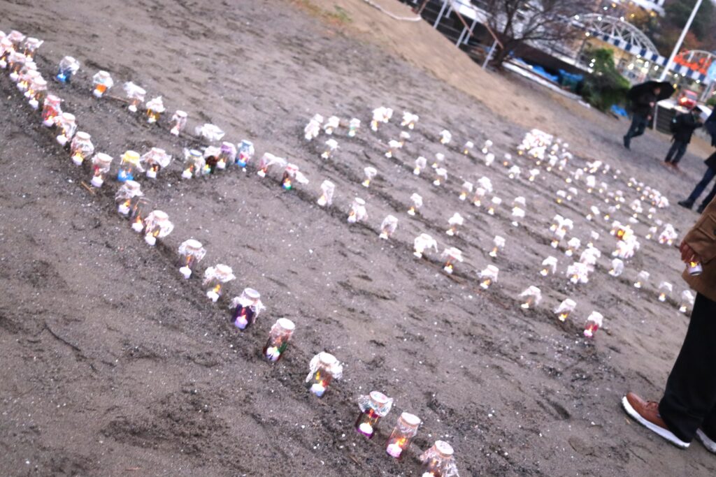 ビンにはそれぞれが思い思いにメッセージやイラストなど描いて、砂浜に並べていきます。