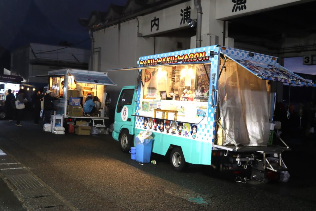 内浦漁協荷捌所前には、「ラブライブ!サンシャイン!!」とコラボした店舗をはじめ、たくさんの屋台やキッチンカーが並び大にぎわいでした。