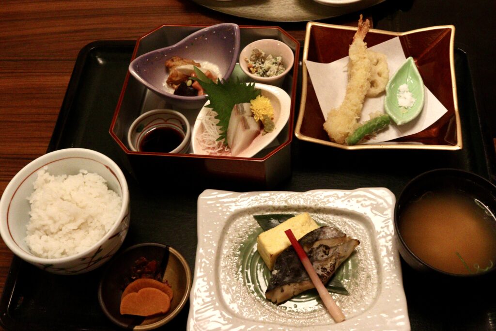 天ぷらに焼き魚、お刺身などのお料理が盛り合わせになっています。