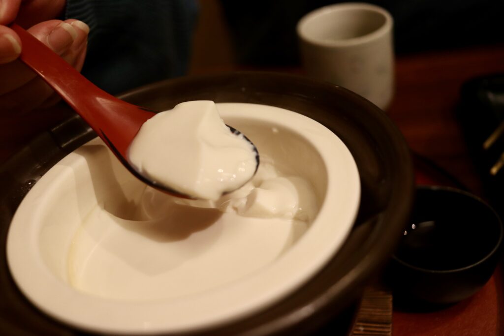 火にかけられた鍋で提供されて、とろとろ柔らかい食感と大豆のうま味を感じる味わいが素敵!