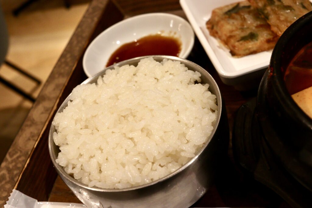 セットのごはんは銀色の器で提供されて、こちらも本格韓国グルメの雰囲気たっぷり。