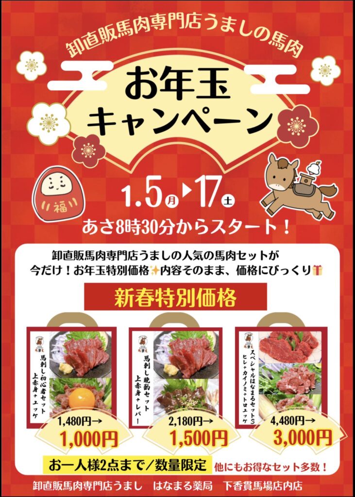 沼津市下香貫「はなまる薬局下香貫馬場店」さんで、馬肉セットの特別販売企画が行われます!