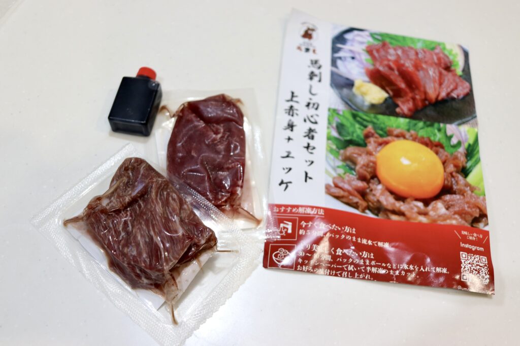 買ってきたのは上赤身とユッケの「馬刺し初心者セット」