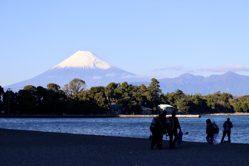 大瀬海水浴場から大瀬崎を見ると、綺麗な海とその向こうに雄大な富士山が見えたり!