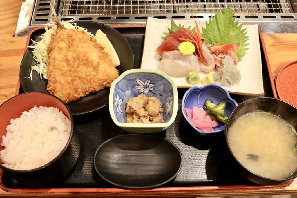 お刺身の盛り合わせにアジフライ、小鉢もついたボリューム満点の一品です!