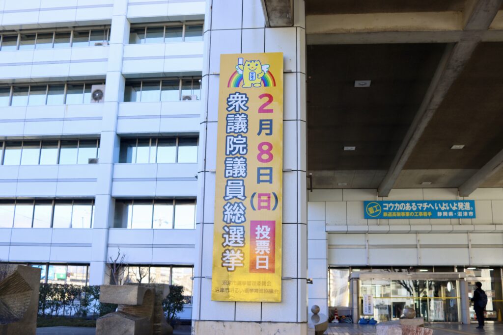 沼津市役所では1月28日(水)から2月7日(土)まで、金岡・原・愛鷹・戸田の各地区センターでも2月4日(月)から7日(土)まで期日前投票が可能とのこと。