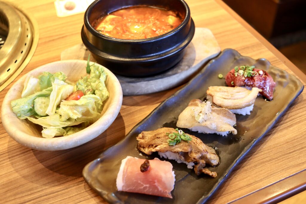 沼津市高島本町にある「カルビ一丁 沼津店」さんで、ランチメニューの肉寿司とスンドゥブチゲのセットをいただきました。