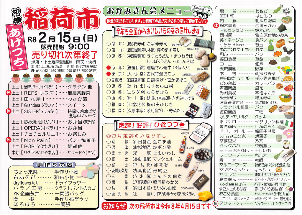 というわけで今回は沼津市上土町「あげつち商店街」で2月15日に開催される朝市「あげつち稲荷市」の話題でした!