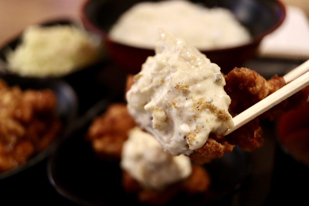 カラッと揚がった唐揚げの上にはクリーミーなタルタルソースがたっぷり!