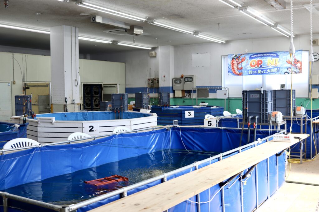 施設の中には大きな5台の水槽が設けられ、ここでオニテナガエビ釣りを楽しむことができました。