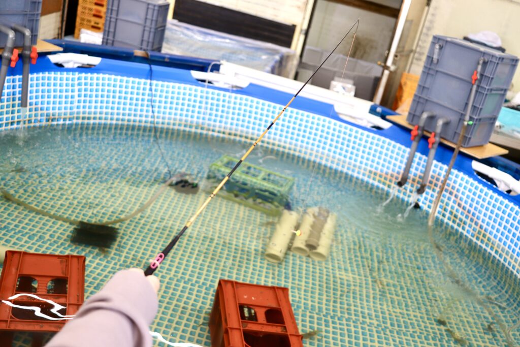 施設の方から釣竿を借り、エサをつけた釣り糸を水槽に垂らします。
