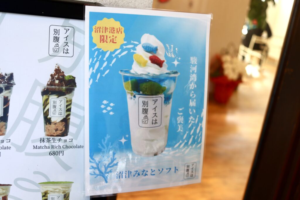 全国に展開する「アイスは別腹」さんですが、ここ沼津港店限定で提供されるその名も「沼津みなとソフト」です。