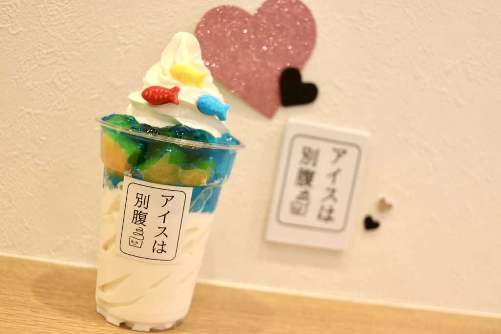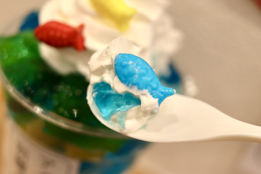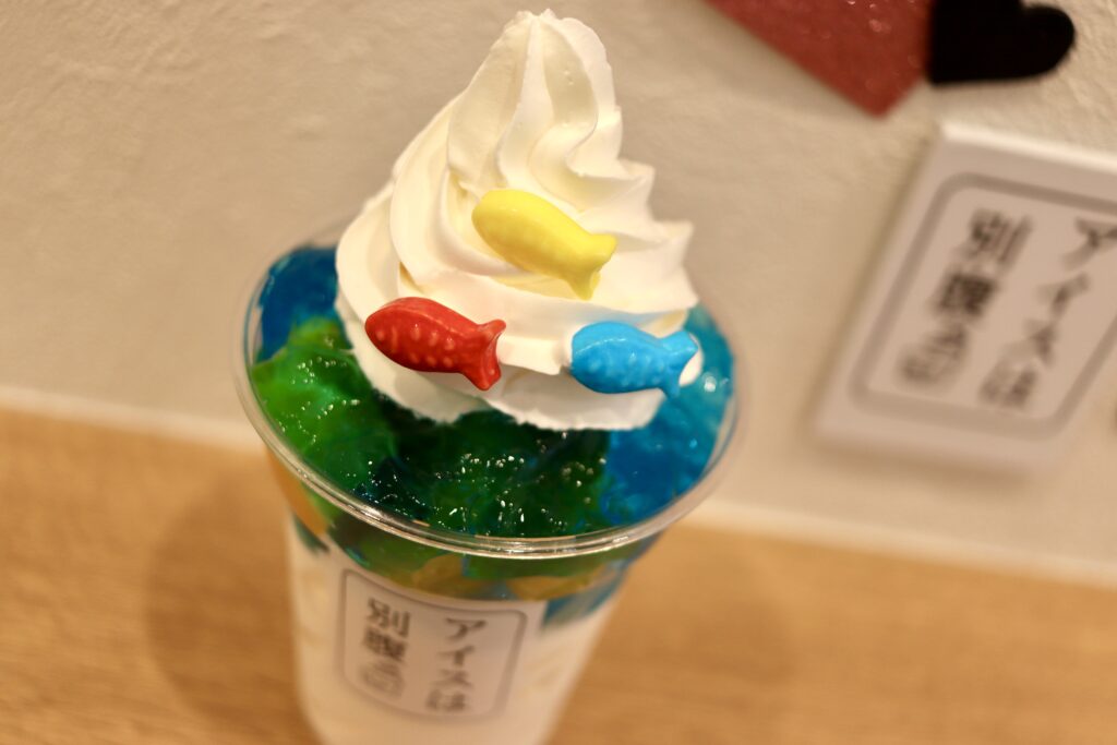 トッピングにたっぷりと盛られたホイップクリームには赤・青・黄色の魚型のラムネ。