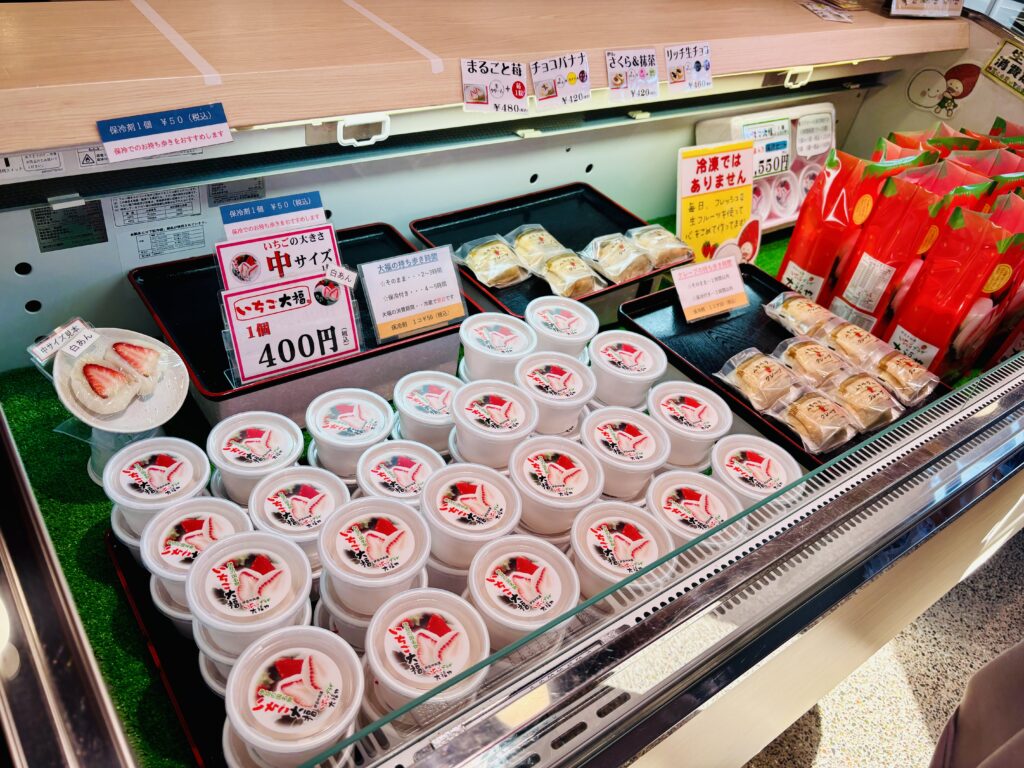 コンパクトなお店の中のショーケースには、可愛らしいいちご大福がずらり!