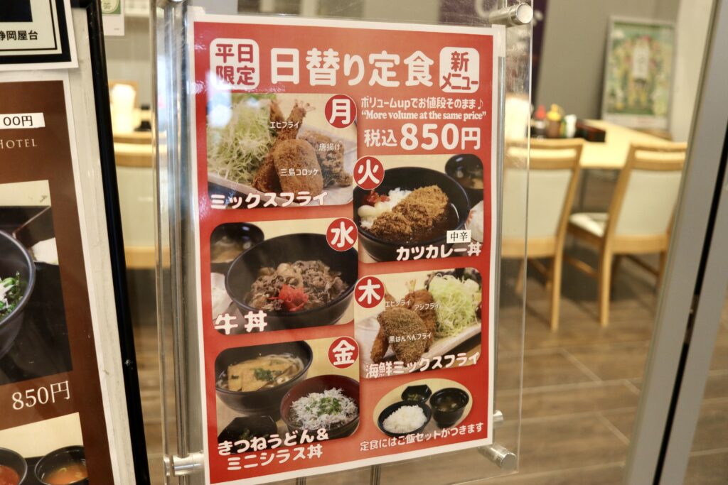 「ボリュームupでお値段そのまま」のキャッチコピーとともに、月曜日から金曜日まで日替わりのさまざまなメニューが味わえます。