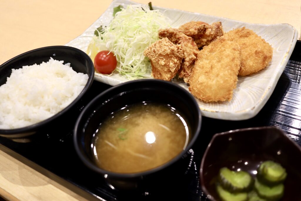 ポテトがとろりとしたご当地「みしまコロッケ」に、カリッとジューシーな鶏の唐揚げもセットになった王道感ある定食。
