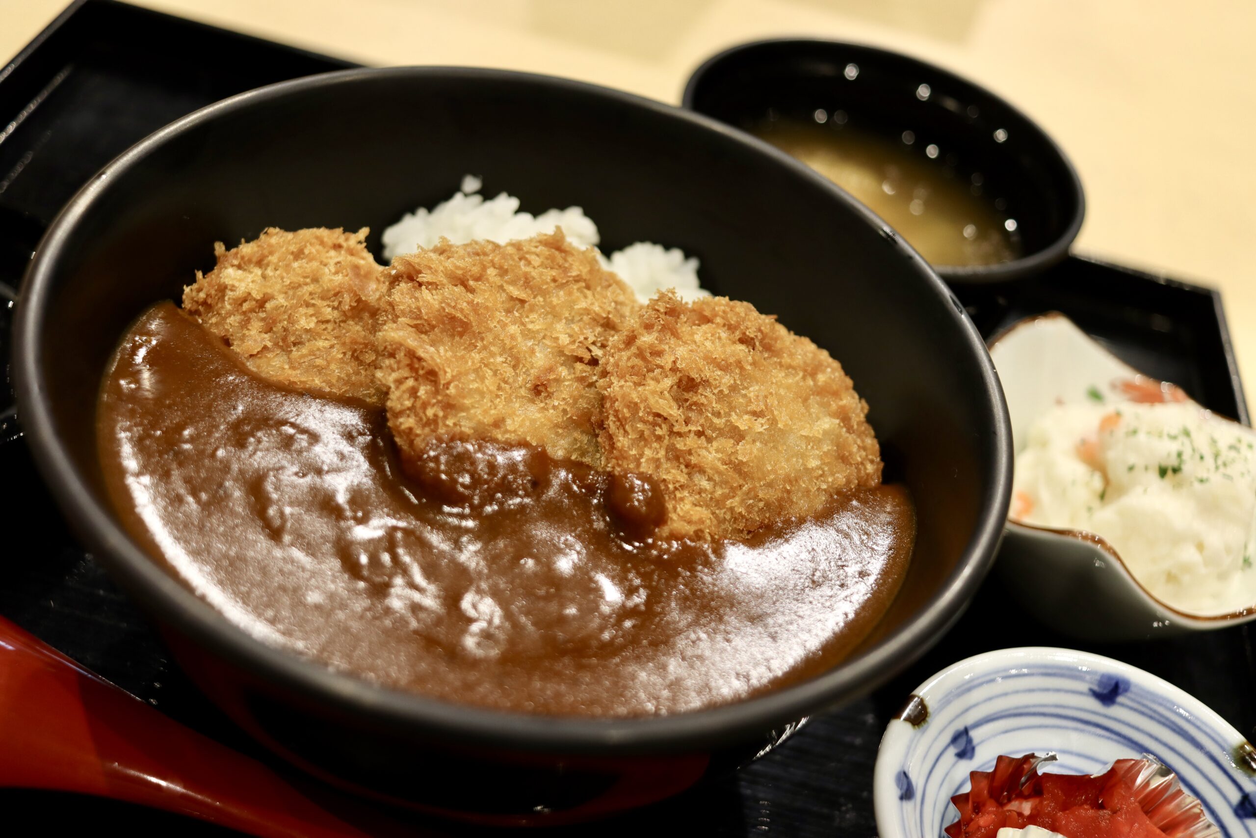大きな丼に盛り付けられたカツカレー丼に、お味噌汁とポテトサラダ、福神漬け+らっきょうもついて850円税込、というお値段が嬉しいところです。