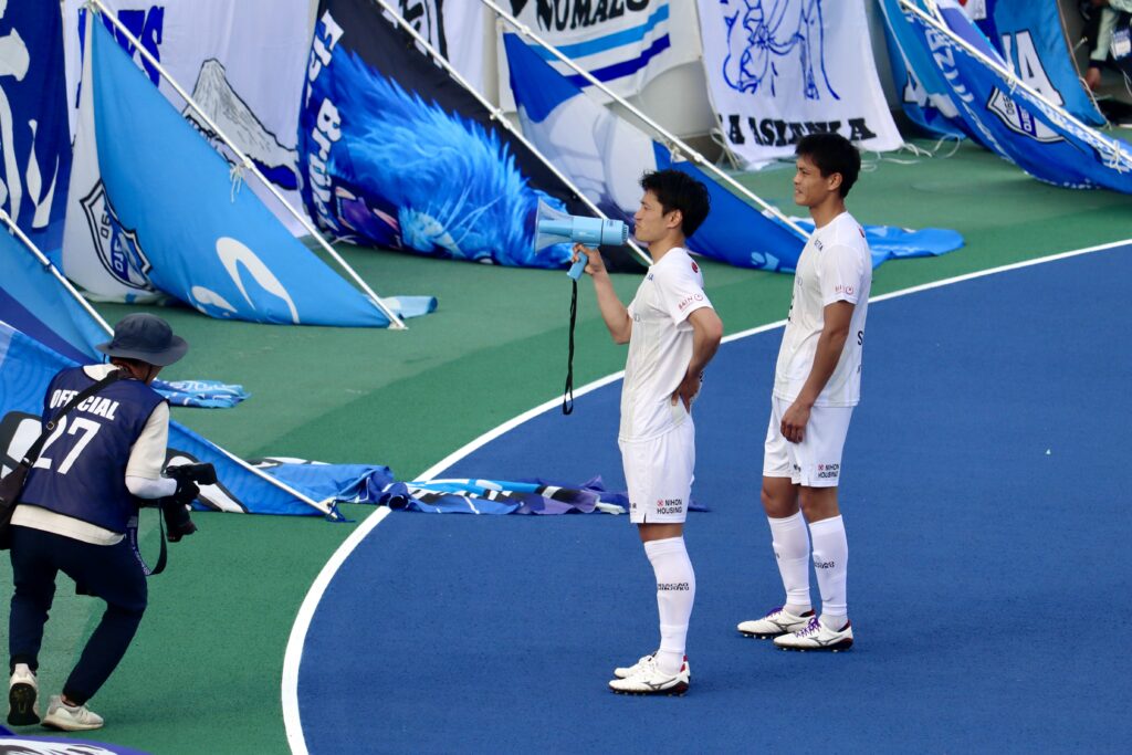 試合後はクリアソン新宿の坂本修佑選手と前澤甲気選手がアスルのゴール裏へ。