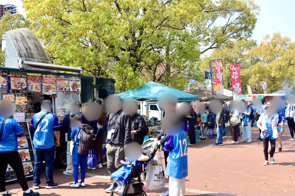 試合が行われる当日には、スタジアムの外にたくさんのグルメ屋台が出店します。