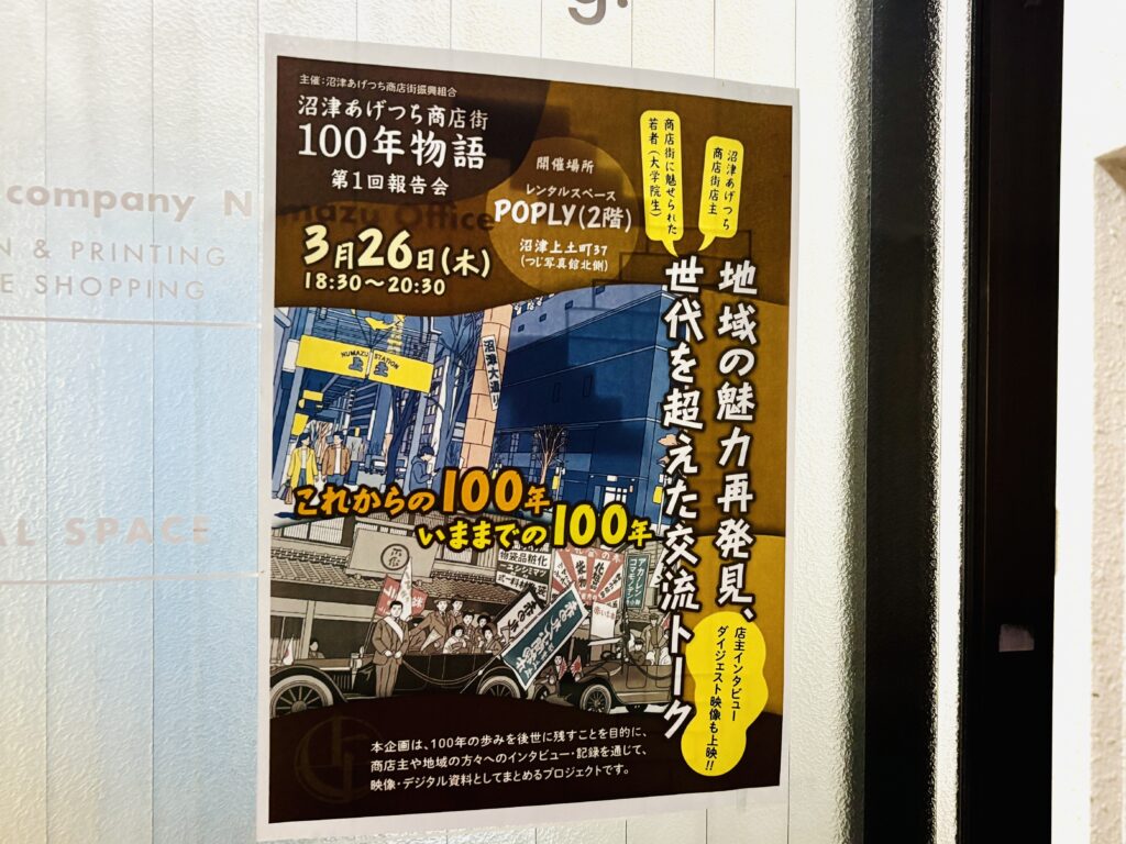 というわけで今回は、2026年3月26日(木)に行われたあげつち商店街での「沼津あげつち商店街100年物語」の報告会に行ってきました。