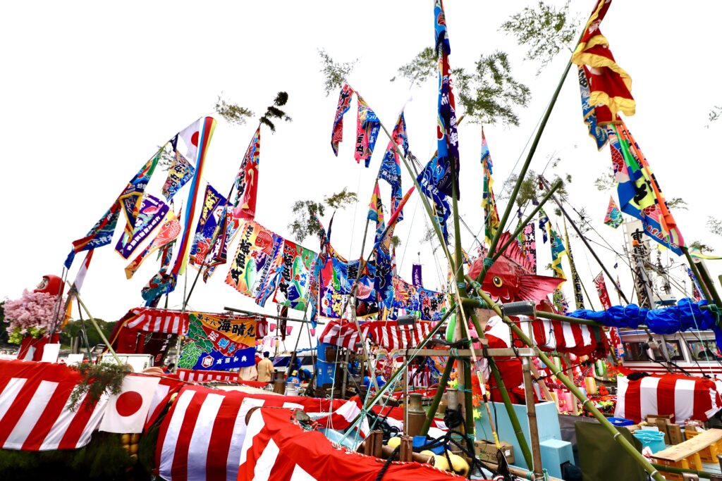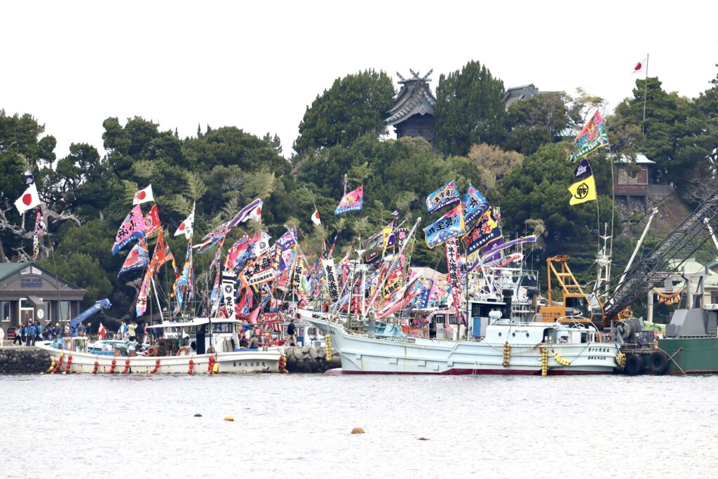 遠目に見ても、それぞれの船に掲げられた色とりどりの大漁旗が風になびいていて壮観です。