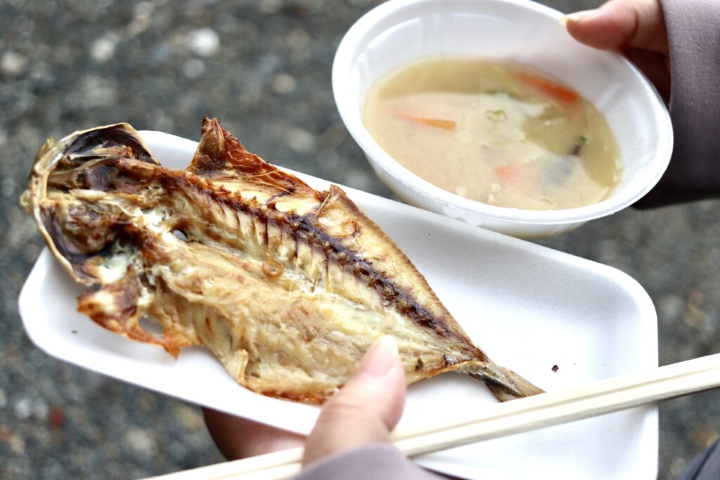香ばしく焼けてジューシーなうま味のひものに、海風が吹く中で味わう風味たっぷりの豚汁がひときわ美味しく感じました!