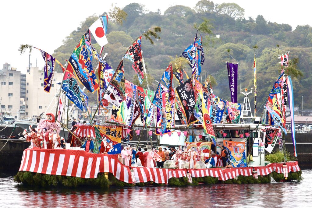 大漁旗をなびかせて港に入ってくる船のパレード、こちらも見事なものです!