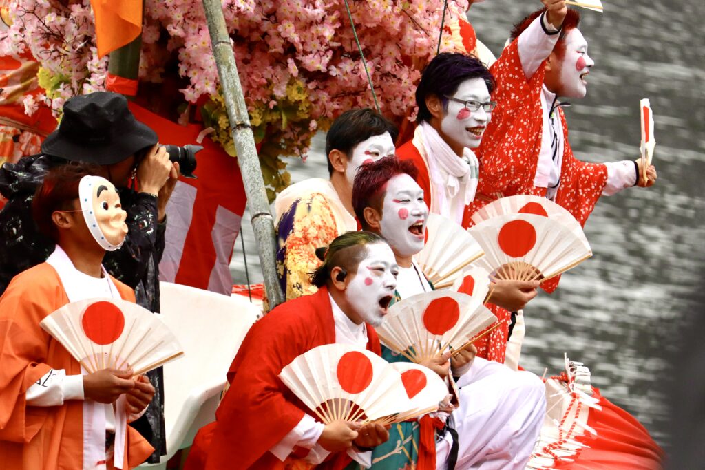 船の上では、このお祭りの最大の特徴である、白塗り・長襦袢の女装した漁師さんたちが盛り上がっています。