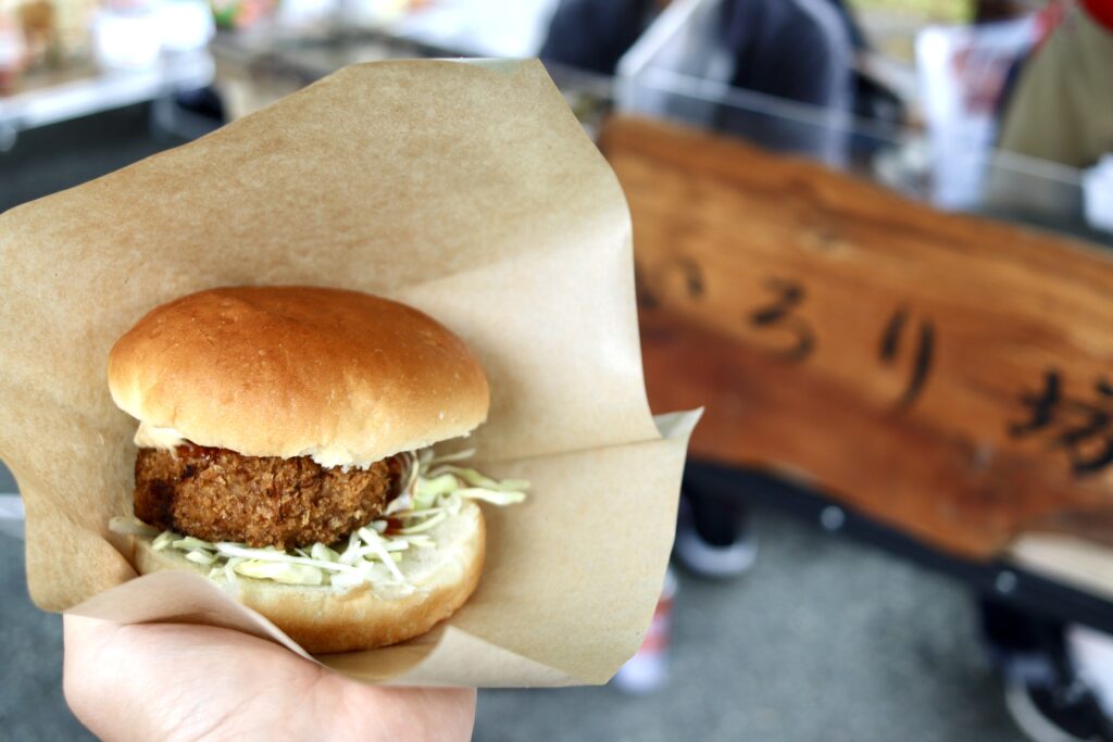 内浦でゲストハウスを営み、イベントにも頻繁に出店されている「いろり坊」さんのメンチカツバーガー。