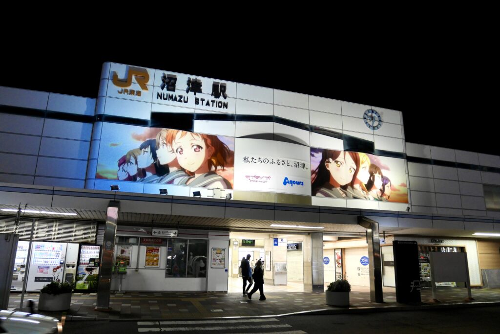 駅舎に大きくラッピングされたAqoursのイラストと「私たちのふるさと、沼津。」のメッセージももうすっかりおなじみ、という感じです。