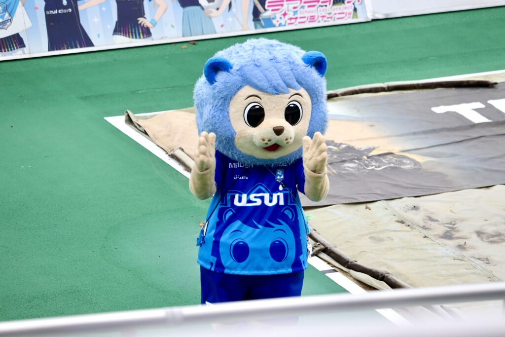 マスコットキャラクター「アスルくん」も時おりスタンドの近くまで来て一緒に応援してくれました。