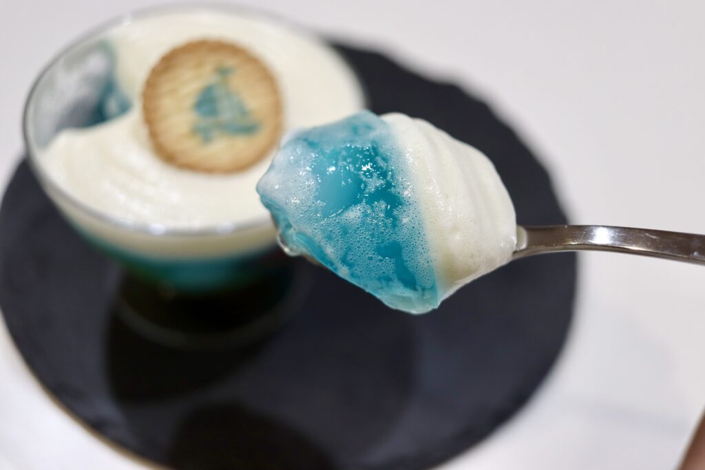 曜ちゃんのイメージカラー、ライトブルーのゼリーにはたっぷりのフルーツ、その上にはシトラスのムース、トッピングに曜ちゃんのアイコンをあしらったビスケット、という可愛らしい一品です。