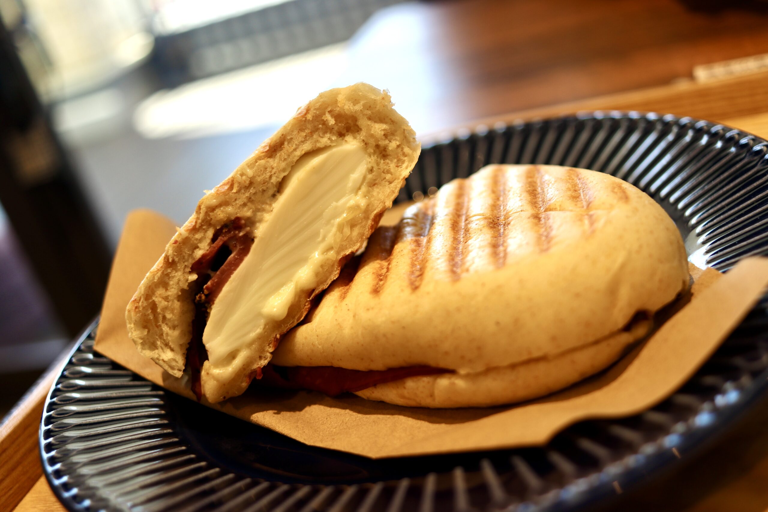 今回ランチにいただいたのは、静岡東部の老舗パン工房で特注しているという全粒粉生地のコッペパンを使った「パニーニ」。