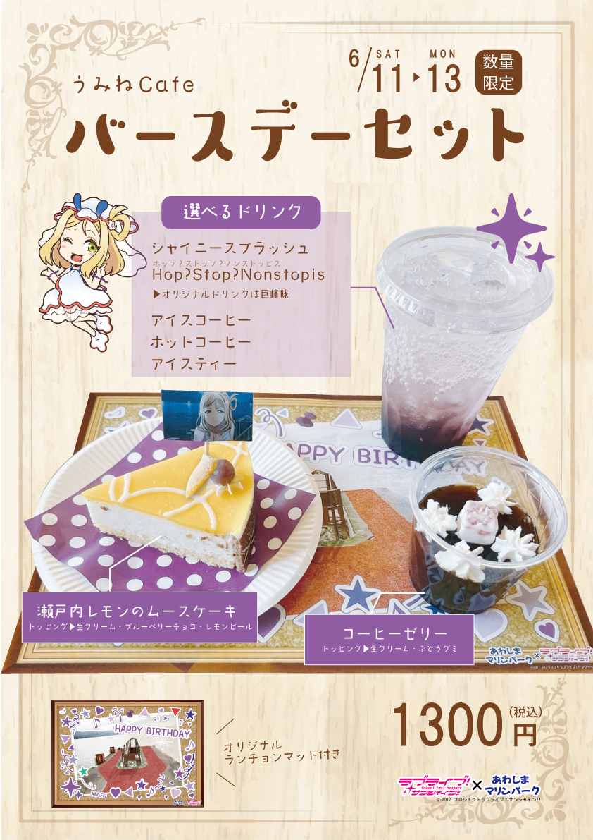 鞠莉ちゃんの好きなレモン、コーヒーや、イメージカラーのヴァイオレットにちなんだメニューです。